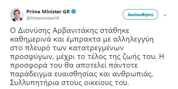 «Ο Διονύσης Αρβανιτάκης στάθηκε καθημερινά και έμπρακτα με αλληλεγγύη στο πλευρό των κατατρεγμένων προσφύγων, μέχρι το τέλος της ζωής του», έγραψε ο πρωθυπουργός με ανάρτηση του στο Τwitter για τον θάνατο του φούρναρη της Κω.