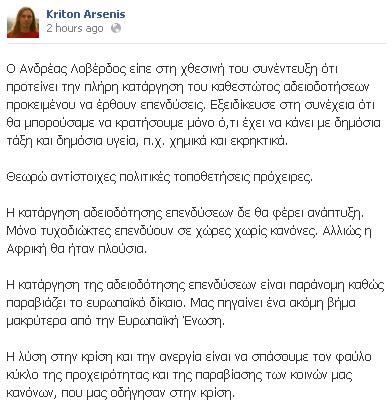 Σφοδρή κριτική στην τοποθέτηση του Ανδρέα Λοβέρδου περί πλήρους κατάργησης του καθεστώτος αδειοδοτήσεων προκειμένου να έρθουν επενδύσεις, ασκεί ο ευρωβουλευτής του ΠΑΣΟΚ, Κρίτων Αρσένης.