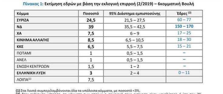 Η έρευνα διενεργήθηκε μετά την επικύρωση της Συμφωνίας των Πρεσπών και αποτυπώνει την επίδρασή της στο εκλογικό δείγμα. Όπως επισημαίνουν οι αναλυτές της εταιρείας «η Νέα Δημοκρατία συνεχίζει να απορροφά το σημαντικότερο τμήμα της εκλογικής βάσης των τριών νεοπαγών κομμάτων της μνημονιακής περιόδου που αποσυντίθενται (Ποτάμι, ΑΝΕΛ, Ένωση Κεντρώων). Αυτό σημαίνει, ότι η αποδυνάμωση των τριών κομμάτων της 8κομματικής Βουλής του 2015 λειτουργεί, διττά, υπέρ της ΝΔ και εις βάρος του ΣΥΡΙΖΑ. Αφενός, διότι η ΝΔ εισπράττει, στο επίπεδο της εκλογικής βάσης, μεγαλύτερο τμήμα της δυσαρέσκειας από την παρούσα διακυβέρνηση. Αφετέρου, διότι η συρρίκνωσή τους διευκολύνει την επίτευξη αυτοδυναμίας από το πρώτο κόμμα, εξαιτίας της λειτουργίας του εκλογικού νόμου. Διεκδικεί, επομένως, βάσιμα την κοινοβουλευτική αυτοδυναμία».