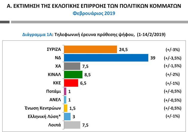 Στο κομμάτι της εκλογικής επιρροής, το κόμμα της αξιωματικής αντιπολίτευσης συγκεντρώνει ποσοστό 39%, ενώ ο ΣΥΡΙΖΑ μόλις 24,5%. Στην τρίτη θέση βρίσκεται το Κίνημα Αλλαγής με 8,5% και ακολουθούν Χρυσή Αυγή με 7,5%, ΚΚΕ με 6,5%, Ελληνική Λύση στο 3%. Η Ένωση Κεντρώων με 1,5%, το Ποτάμι και οι ΑΝΕΛ με 1% μένουν εκτός Βουλής.
