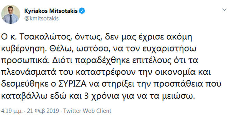 Ο κ. Τσακαλώτος, όντως, δεν μας έχρισε ακόμη κυβέρνηση. Θέλω, ωστόσο, να τον ευχαριστήσω προσωπικά. Διότι παραδέχθηκε επιτέλους ότι τα πλεονάσματά του καταστρέφουν την οικονομία και δεσμεύθηκε ο ΣΥΡΙΖΑ να στηρίξει την προσπάθεια που καταβάλλω εδώ και 3 χρόνια για να τα μειώσω», έγραψε ο κ. Μητσοτάκης.