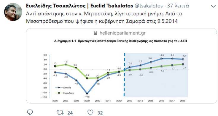 Μέσω του προσωπικού λογαριασμού του στο twitter, απάντησε ο υπουργός Οικονομικών Ευκλείδης Τσακαλώτος στο «τιτίβισμα» του προέδρου της ΝΔ Κυριάκου Μητσοτάκη ότι «παραδέχθηκε (ο κ. Τσακαλώτος) επιτέλους ότι τα πλεονάσματά του καταστρέφουν την οικονομία και δεσμεύθηκε ο ΣΥΡΙΖΑ να στηρίξει την προσπάθεια που καταβάλλω εδώ και 3 χρόνια για να τα μειώσω».