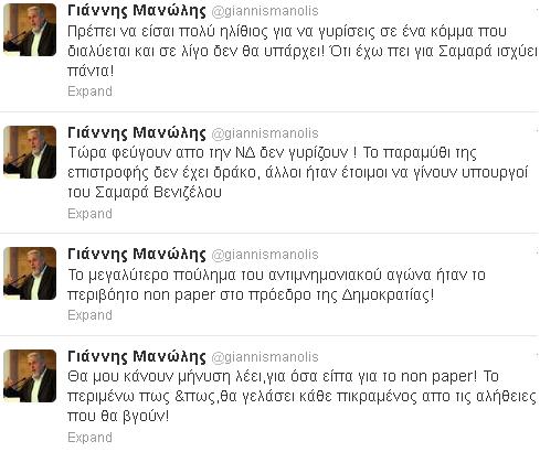 Ο κ. Μανώλης απάντησε μέσω twitter στα σενάρια που κάνουν λόγο για μήνυση εναντίον του σχετικά με τα όσα είπε για το non paper.
