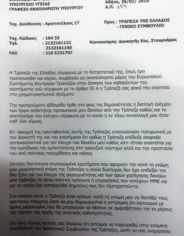 Η επιστολή αυτή έρχεται μετά το σάλο που προκάλεσε η αποκάλυψη της χορήγησης καταναλωτικού δανείου στον αναπληρωτή υπουργό από την Attica Bank.