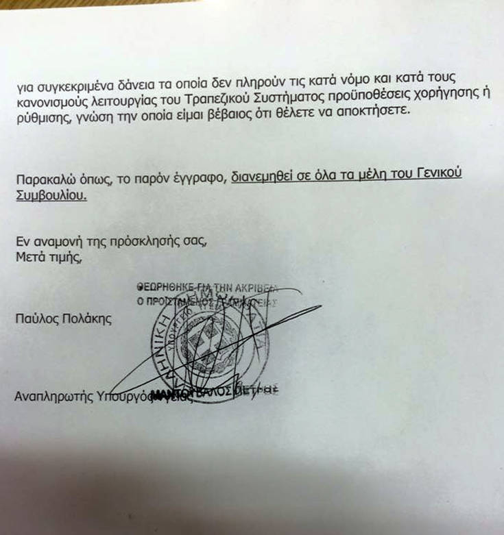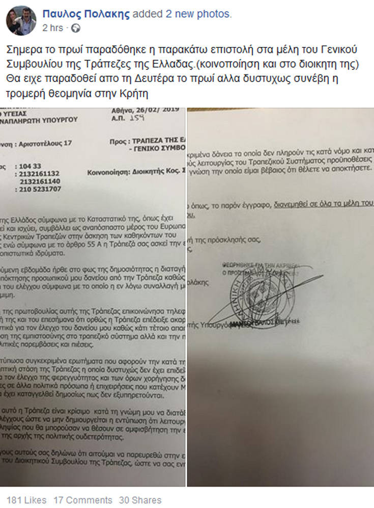 «Σήμερα το πρωί παραδόθηκε η παρακάτω επιστολή στα μέλη του Γενικού Συμβουλίου της Τράπεζες της Ελλάδας.(κοινοποίηση και στο διοικητή της). Θα είχε παραδοθεί από τη Δευτέρα το πρωί αλλά δυστυχώς συνέβη η τρομερή θεομηνία στην Κρήτη» έγραψε στο Facebook.