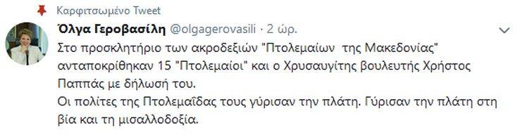 Η Όλγα Γεροβασίλη, επίσης, σε ανάρτηση της στο Τwitter, δείχνει ευθέως τη Χρυσή Αυγή ως «παρούσα» στο «προσκλητήριο», που είχε γίνει από χτες μέσω του διαδικτύου για συγκέντρωση στην Πτολεμαΐδα των αυτοαποκαλούμενων «Πτολεμαίων της Μακεδονίας», επικαλούμενη και δήλωση που έκανε ο Χρυσαυγίτης βουλευτής Χρήστος Παππάς για τα επεισόδια, όποίος σε ανάρτησή του στο Twitter χαρακτήρισε «προδότες» τους αστυνομικούς που «χτυπούν αλύπητα τους Έλληνες πατριώτες».