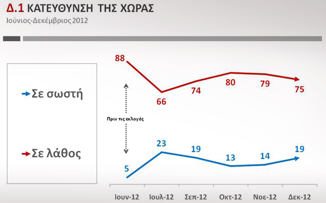 Πιο αναλυτικά, αυξημένο, σε σύγκριση με το προηγούμενο Βαρόμετρο, είναι το ποσοστό των πολιτών που θεωρούν ότι η κατεύθυνση της χώρας είναι σε σωστό δρόμο. Ωστόσο, οι περισσότεροι πολίτες κρίνουν το αντίθετο. Το 19% κρίνει ότι η κατεύθυνση της χώρας είναι σωστή, έναντι του 75% που κρίνει ότι είναι λάθος. Τον περασμένο Ιούνιο τα αντίστοιχα ποσοστά ήταν 5% και 88%.