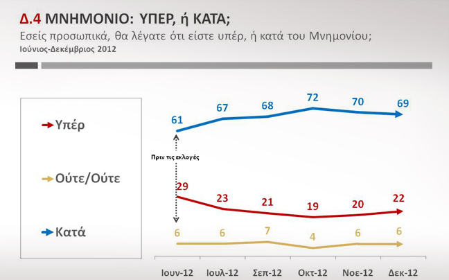 Οριακά μειωμένο στο 69% από 70% είναι το ποσοστό των ερωτηθέντων που τάσσεται κατά του μνημονίου, ενώ ελαφρώς αυξημένο στο 22% από 20% είναι το ποσοστό των ερωτηθέντων που τάσσονται υπέρ του μνημονίου.