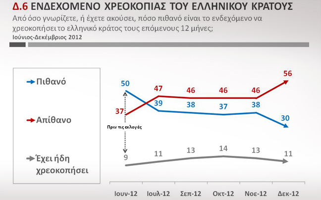 Το 56% των ερωτηθέντων θεωρούν απίθανο το ενδεχόμενο χρεοκοπίας, ενώ στο 30% από 38% είναι το ποσοστό των πολιτών που θεωρούν πιθανό ένα τέτοιο ενδεχόμενο.