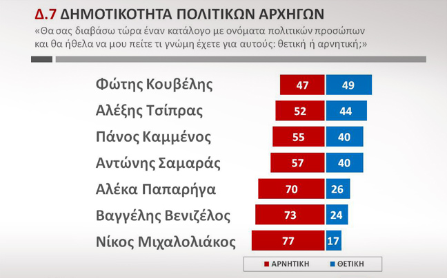 Δεύτερος δημοφιλέστερος είναι ο Αλέξης Τσίπρας με 44% και ακολουθούν οι Αντώνης Σαμαράς με 40% και Πάνος Καμμένος επίσης με 40%. Στη συνέχεια ακολουθεί η Αλέκα Παπαρήγα με 26%, ο Ευάγγελος Βενιζέλος με 24% και τελευταίος ο Νίκος Μιχαλολιάκος με 17%.