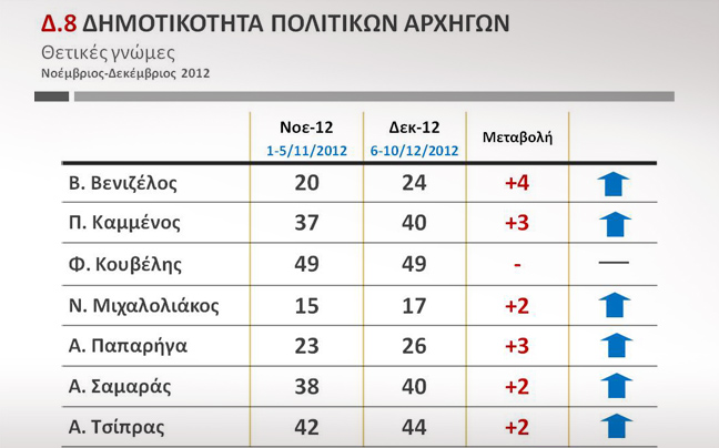 Ο Φώτης Κουβέλης παραμένει ο πιο δημοφιλής πολιτικός αρχηγός με 49%, ενώ αυξημένα είναι τα ποσοστά όλων των αρχηγών σε σύγκριση με το προηγούμενο Βαρόμετρο του Νοεμβρίου.