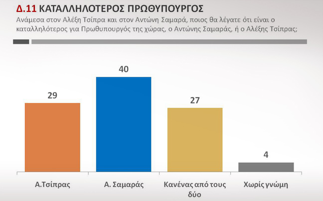Σταθερά καταλληλότερος πρωθυπουργός εμφανίζεται ο Αντώνης Σαμαράς με 40% έναντι 29% του Αλέξη Τσίπρα.