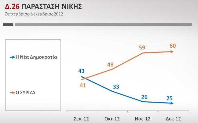 Στην παράσταση νίκης το 60% των ερωτηθέντων πιστεύουν ότι πρώτο κόμμα θα αναδειχθεί ο ΣΥΡΙΖΑ, ενώ η Ν.Δ. έπεται με 25%.