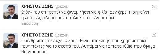 Ο πρώην εκπρόσωπος Τύπου μέσα από το twitter του τον χαρακτήρισε υποκριτή και έγραψε πως δεν του επιτρέπει να ξαναμιλήσει για φιλία, αφού δεν ξέρει τι σημαίνει.