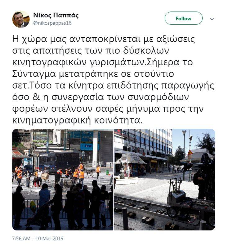«Η χώρα μας ανταποκρίνεται με αξιώσεις στις απαιτήσεις των πιο δύσκολων κινηματογραφικών γυρισμάτων. Σήμερα το Σύνταγμα μετατράπηκε σε στούντιο σετ. Τόσο τα κίνητρα επιδότησης παραγωγής όσο και η συνεργασία των συναρμόδιων φορέων στέλνουν σαφές μήνυμα προς την κινηματογραφική κοινότητα» αναφέρει στην ανάρτησή του ο κ. Παππάς.