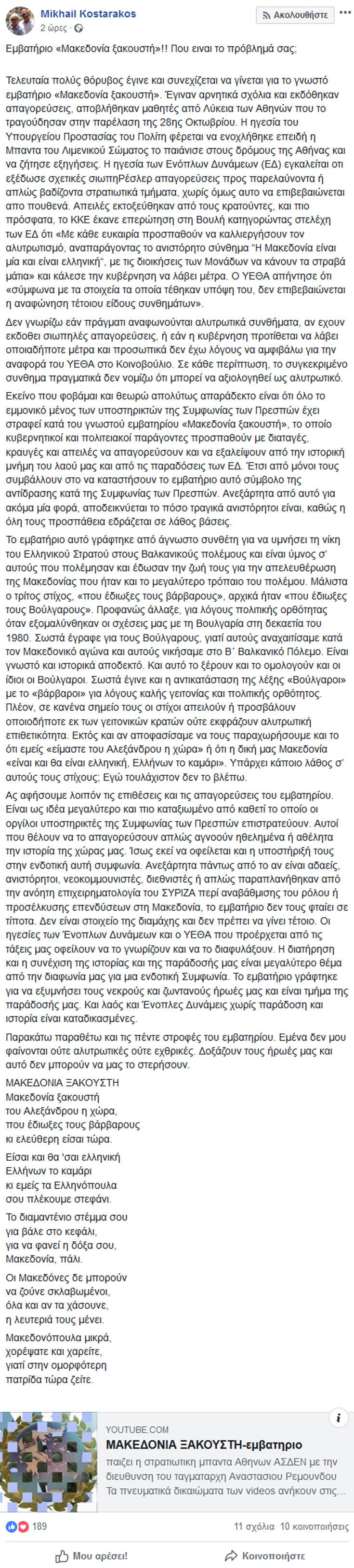 Ο Στρατηγός Μιχάλης Κωσταράκος, με ανάρτηση στον προσωπικό του λογαριασμό παρενέβη στη συζήτηση για τη Μακεδονία και τη Συμφωνία των Πρεσπών, εξαπολύοντας επίθεση εναντίον όσων φέρονται να ενοχλούνται από το εμβατήριο «Μακεδονία ξακουστή».
