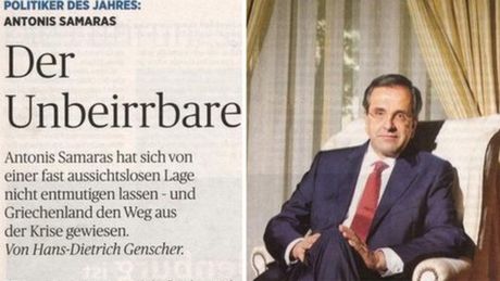 Και ο Χανς-Ντίτριχ Γκένσερ συνεχίζει: «Ο Αντώνης Σαμαράς κατέδειξε τι σημαίνει για μία χώρα να έχει στη ηγεσία της μια προσωπικότητα που μπορεί να αναγνωρίσει τον σωστό δρόμο σε μια απέλπιδα κατάσταση και να διανύσει αυτόν τον δρόμο ενάντια σε όλες τις αντιστάσεις».
