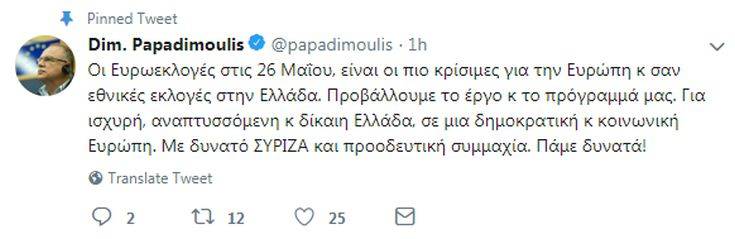 Αυτό αναφέρει σε ανάρτησή του στον προσωπικό του λογαριασμό στο Twitter, ο αντιπρόεδρος του Ευρωκοινοβουλίου και επικεφαλής της Ευρωομάδας του ΣΥΡΙΖΑ, Δημήτρης Παπαδημούλης, μετά την ανακοίνωση των 16 πρώτων ονομάτων του ψηφοδελτίου του ΣΥΡΙΖΑ για τις Ευρωεκλογές.