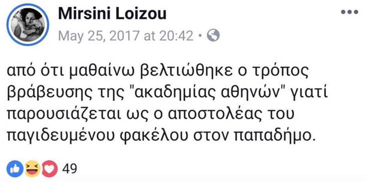 Έντονες αντιδράσεις έχουν προκαλέσει αναρτήσεις της κόρης του μεγάλου μουσικοσυνθέτη Μάνου Λοΐζου και υποψήφιας πλέον του ΣΥΡΙΖΑ στις ευρωεκλογές 2019, Μυρσίνης Λοΐζου, στα μέσα κοινωνικής δικτύωσης.