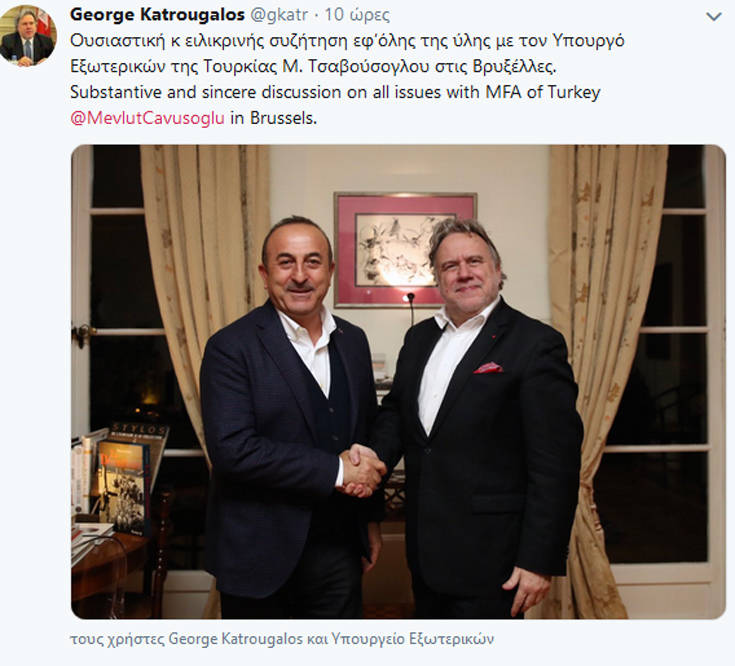 Σε πολύ καλό κλίμα φαίνεται πως πραγματοποιήθηκε η συνάντηση που είχε το βράδυ της Τετάρτης, ο υπουργός Εξωτερικών Γιώργος Κατρούγκαλος με τον Τούρκο ομόλογό του Μεβλούτ Τσαβούσογλου στις Βρυξέλλες, στο περιθώριο της Διάσκεψης ΕΕ-ΟΗΕ για τη Συρία.
