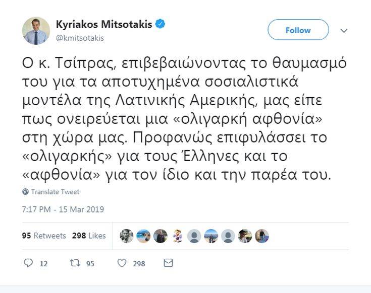 Σχολιάζοντας την αναφορά του πρωθυπουργού, ο Κυριάκος Μητσοτάκης έγραψε στο Twitter: «Ο κ. Τσίπρας, επιβεβαιώνοντας το θαυμασμό του για τα αποτυχημένα σοσιαλιστικά μοντέλα της Λατινικής Αμερικής, μας είπε πως ονειρεύεται μια “ολιγαρκή αφθονία” στη χώρα μας. Προφανώς επιφυλάσσει το “ολιγαρκής” για τους Έλληνες και το “αφθονία” για τον ίδιο και την παρέα του».