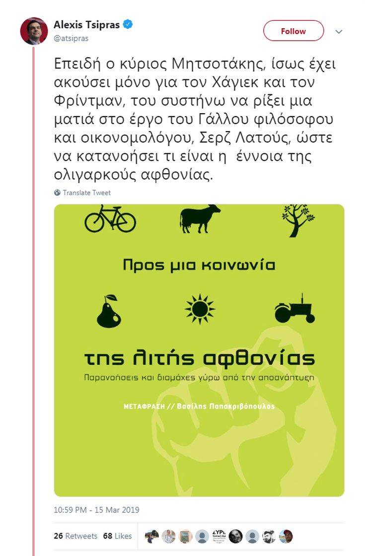 Απαντώντας, επίσης μέσω Twitter, ο Αλέξης Τσίπρας διευκρίνισε: «Επειδή ο κύριος Mητσοτάκης, ίσως έχει ακούσει μόνο για τον Χάγιεκ και τον Φρίντμαν, του συστήνω να ρίξει μια ματιά στο έργο του Γάλλου φιλόσοφου και οικονομολόγου, Σερζ Λατούς, ώστε να κατανοήσει τι είναι η έννοια της ολιγαρκούς αφθονίας».