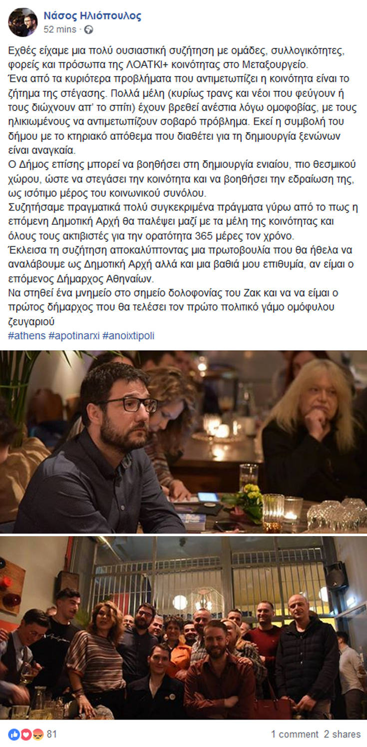 Μαζική ήταν η παρουσία της ΛΟΑΤΚΙ+ κοινότητας στο κάλεσμα που απεύθυνε ο υποψήφιος Δήμαρχος Αθηναίων, με την «Ανοιχτή Πόλη», Νάσος Ηλιόπουλος.