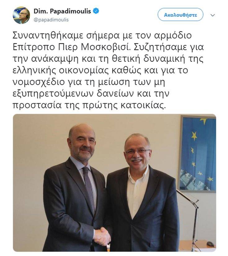 Σε ανάρτησή του στο Twitter, ο κ. Παπαδημούλης σημειώνει: «Συναντηθήκαμε σήμερα με τον αρμόδιο Επίτροπο Πιερ Μοσκοβισί. Συζητήσαμε για την ανάκαμψη και τη θετική δυναμική της ελληνικής οικονομίας καθώς και για το νομοσχέδιο για τη μείωση των μη εξυπηρετούμενων δανείων και την προστασία της πρώτης κατοικίας».