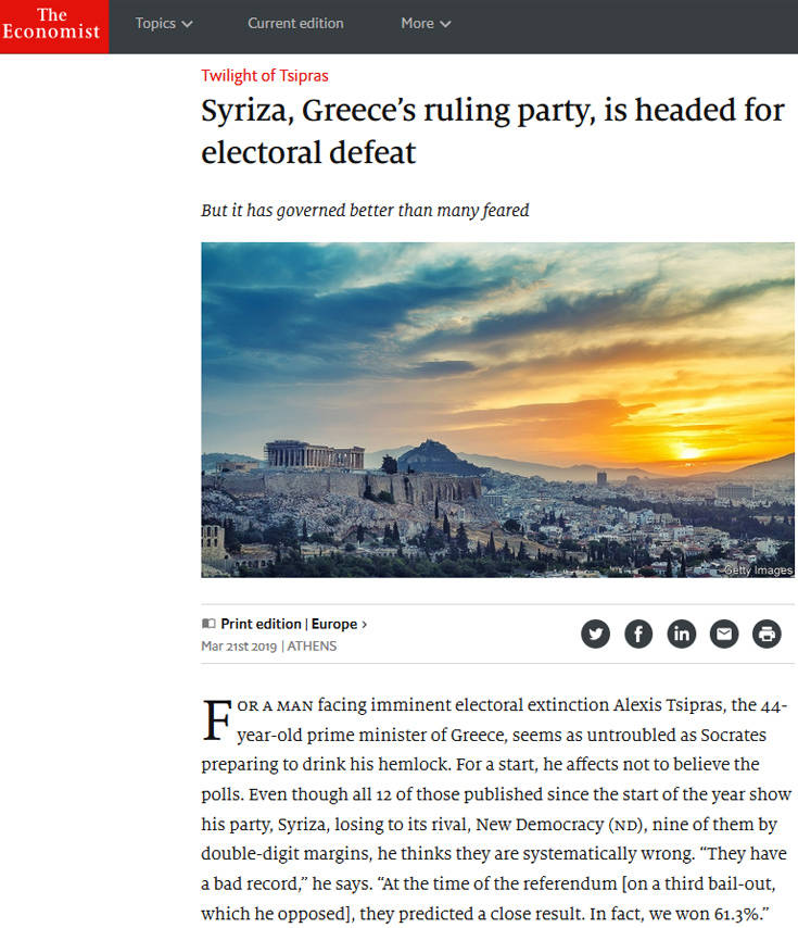 Με τον Σωκράτη, που ετοιμαζόταν ατάραχος να πιει το κώνειο, παρομοιάζει τον πρωθυπουργό Αλέξη Τσίπρα ο Economist, σε άρθρο του με τίτλο «ΣΥΡΙΖΑ, το κυβερνών κόμμα της Ελλάδας κατευθύνεται σε εκλογική ήττα». Γράφει στην κεφαλίδα για το «Λυκόφως του Τσίπρα» αλλά σημειώνει και πως κυβέρνησε καλύτερα από ό,τι πολλοί φοβούνταν.