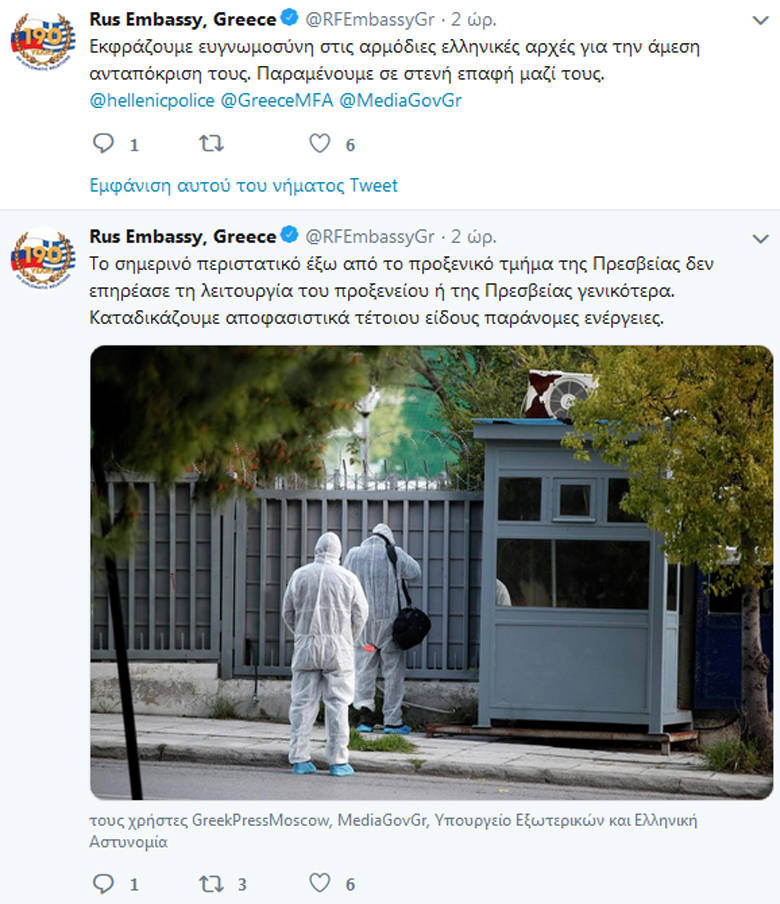 Με δύο αναρτήσεις της στο επίσημο λογαριασμό της στο Twitter, η πρεσβεία της Ρωσίας στην Ελλάδα καταδικάζει αποφασιστικά «τέτοιου είδους παράνομες ενέργειες», όπως επισημαίνει, εκφράζει την «ευγνωμοσύνη της στις ελληνικές αρχές για την άμεση ανταπόκρισή τους» και σημειώνει πως παραμένει σε στενή επαφή μαζί τους.