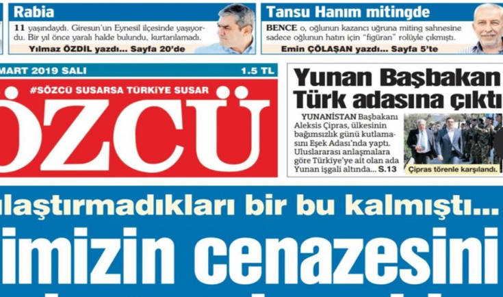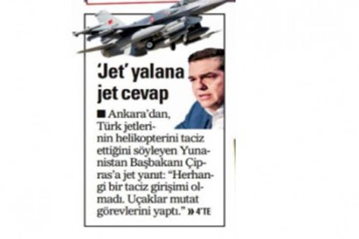 Στην πρώτη σελίδα αρκετών τουρκικών εφημερίδων σήμερα το περιστατικό της παρενόχλησης του ελικοπτέρου που μετέφερε τον Έλληνα πρωθυπουργό Αλέξη Τσίπρα πάνω από το Αγαθονήσι, σύμφωνα με το sigmalive.com.