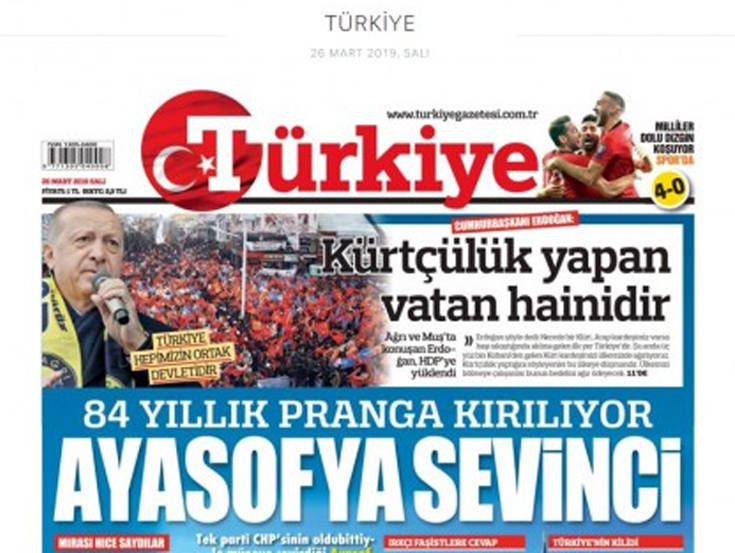 Αντίστοιχα, αρκετές εθνικιστικές εφημερίδες εκφράζουν τη χαρά τους για την απόφαση του Ρετζέπ Ταγίπ Ερντογάν για την Αγία Σοφία, θεωρώντας ότι επιτέλους σπάνε τα δεσμά της μετά από έναν σχεδόν αιώνα.