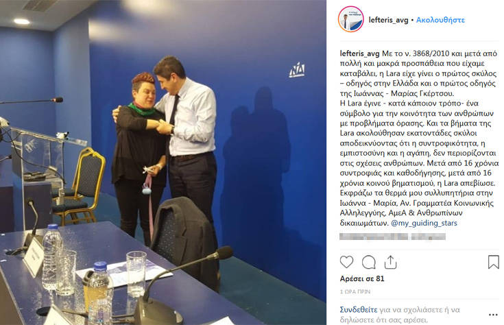 Σε ανάρτησή του στα social media, ο γραμματέας της ΝΔ, Λ. Αυγενάκης, σημειώνει για το θλιβερό νέο: Με το ν. 3868/2010 και μετά από πολλή και μακρά προσπάθεια που είχαμε καταβάλει, η Lara είχε γίνει ο πρώτος σκύλος – οδηγός στην Ελλάδα και ο πρώτος οδηγός της Ιωάννας – Μαρίας Γκέρτσου.