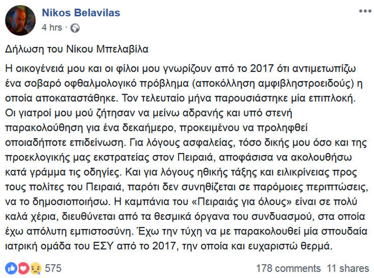 Για λόγους ασφαλείας, τόσο δικής μου όσο και της προεκλογικής μας εκστρατείας στον Πειραιά, αποφάσισα να ακολουθήσω κατά γράμμα τις οδηγίες. Και για λόγους ηθικής τάξης και ειλικρίνειας προς τους πολίτες του Πειραιά, παρότι δεν συνηθίζεται σε παρόμοιες περιπτώσεις, να το δημοσιοποιήσω. Η καμπάνια του “Πειραιάς για όλους” είναι σε πολύ καλά χέρια, διευθύνεται από τα θεσμικά όργανα του συνδυασμού, στα οποία έχω απόλυτη εμπιστοσύνη. Έχω την τύχη να με παρακολουθεί μία σπουδαία ιατρική ομάδα του ΕΣΥ από το 2017, την οποία και ευχαριστώ θερμά».
