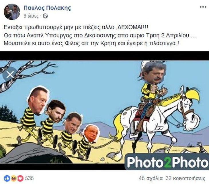 «Εντάξει πρωθυπουργέ μην με πιέζεις άλλο, ΔΕΧΟΜΑΙ!!!Θα πάω Αναπλ Υπουργός στο Δικαιοσύνης από αύριο Τρίτη 2 Απριλίου», έγραψε, δημοσιεύοντας μία εικόνα που του έστειλε ένας φίλος του από την Κρήτη. Σε αυτή ο Παύλος Πολάκης παρουσιάζεται ως Λούκυ Λουκ, που σέρνει μαζί με την Ντόλι τους Ντάλτον, οι οποίοι έχουν τα πρόσωπα, μεταξύ άλλων, του Γιάννη Στουρνάρα και του Άδωνι Γεωργιάδη.