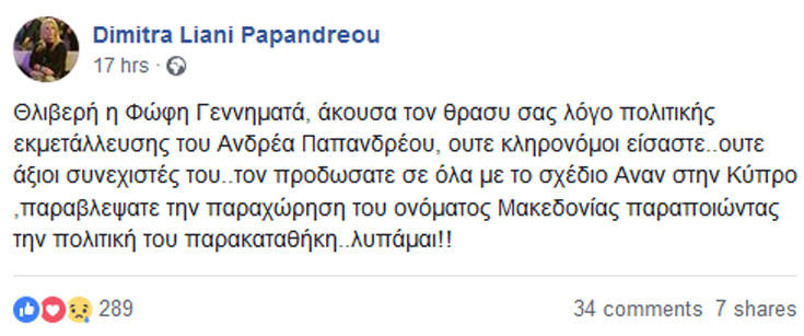 Με ανάρτησή της στο Facebook, η κ. Λιάνη Παπανδρέου χαρακτήρισε ως «θλιβερή» την κ. Γεννηματά: