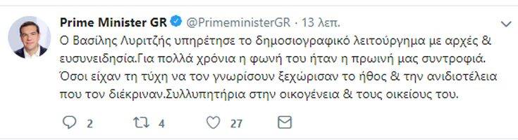 «Ο Βασίλης Λυριτζής υπηρέτησε το δημοσιογραφικό λειτούργημα με αρχές και ευσυνειδησία. Για πολλά χρόνια η φωνή του ήταν η πρωινή μας συντροφιά» αναφέρει σε ανάρτησή του στον προσωπικό του λογαριασμό στο twitter ο πρωθυπουργός Αλέξης Τσίπρας.