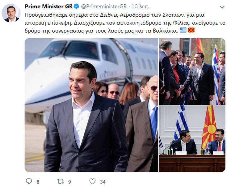 «Προσγειωθήκαμε σήμερα στο Διεθνές Αεροδρόμιο των Σκοπίων, για μια ιστορική επίσκεψη. Διασχίζουμε τον αυτοκινητόδρομο της Φιλίας, ανοίγουμε το δρόμο της συνεργασίας για τους λαούς μας και τα Βαλκάνια», σημειώνει ο Αλέξης Τσίπρας σε ανάρτηση του στο Twitter.