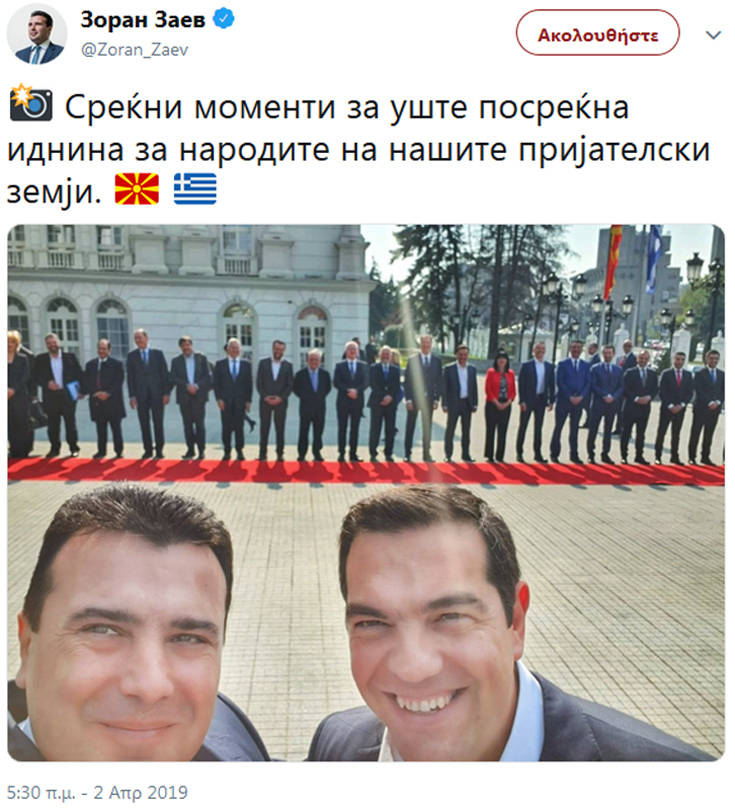 Μία από τις selfie που τράβηξε το πρωί της Τρίτης με τον Αλέξη Τσίπρα κατά την υποδοχή του Έλληνα πρωθυπουργού στο προεδρικό μέγαρο στα Σκόπια ανέβασε στον λογαριασμό του στο twitter και ο Ζόραν Ζάεφ.