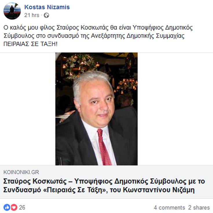 Την υποψηφιότητα του Σταύρου Κοσκωτά ανακοίνωσε ο υποψήφιος δήμαρχος Κώστας Νιζάμης μέσω Facebook. «Ο καλός μου φίλος Σταύρος Κοσκωτάς θα είναι Υποψήφιος Δημοτικός Σύμβουλος στο συνδυασμό της Ανεξάρτητης Δημοτικής Συμμαχίας ΠΕΙΡΑΙΑΣ ΣΕ ΤΑΞΗ!», έγραψε.