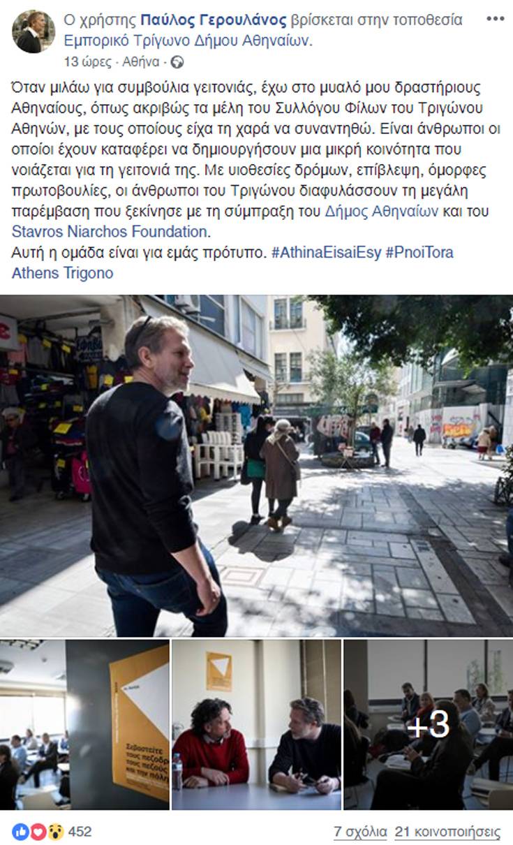 Συνάντηση με το Σύλλογο Φίλων του Τριγώνου Αθηνών είχε ο υποψήφιος δήμαρχος Αθηνών, Παύλος Γερουλάνος. Οι Φίλοι του Τριγώνου είναι μια νεοσύστατη οργάνωση, της οποίας τα μέλη προέρχονται από όλο το φάσμα δραστηριοτήτων του Τριγώνου (κάτοικοι, ξενοδόχοι, ιδιοκτήτες ακινήτων, καταστηματάρχες, καλλιτέχνες).