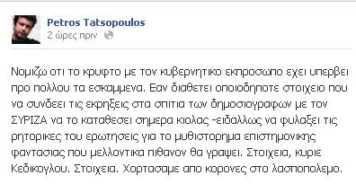Επίθεση στον κυβερνητικό εκπρόσωπο, Σίμο Κεδίκογλου, εξαπέλυσε μέσω του προσωπικού του προφίλ στο Facebook ο βουλευτής του ΣΥΡΙΖΑ και συγγραφέας, Πέτρος Τατσόπουλος.