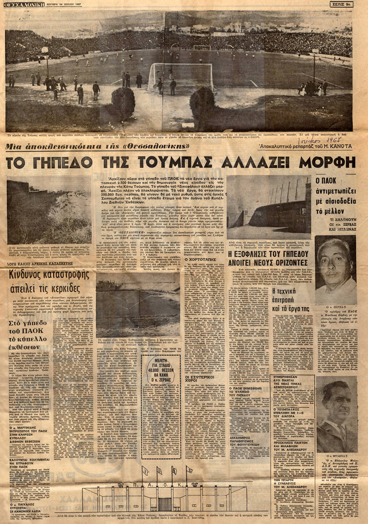 α) Αντίγραφο φύλλου της εφημερίδας «ΘΕΣΣΑΛΟΝΙΚΗ» της 24ηςΙουλίου 1967, όπου αναφέρεται η μελέτη για το στάδιο 40.000 θέσεων που έκανε ο Πολιτικός Μηχανικός και πατέρας του Κωνσταντίνου, Βασίλειος Ζέρβας.