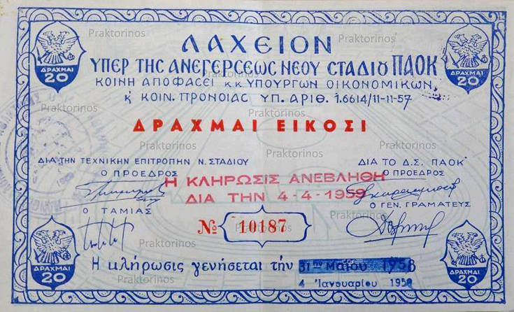 γ) Αντίγραφο του «Λαχείου υπέρ ανεγέρσεως του νέου σταδίου του ΠΑΟΚ» με την αγορά του οποίου οι οπαδοί του ΠΑΟΚ συνείσφεραν στην ανέγερση του νέου γηπέδου.