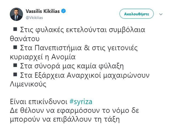 «Επικίνδυνη» χαρακτηρίζει την κυβέρνηση ο Βασίλης Κικίλιας, στην οποία εξαπέλυσε επίθεση μέσω Twitter, με αφορμή τα όσα συνέβησαν χθες το βράδυ στα Εξάρχεια, αλλά και τα περιστατικά μέσα στις φυλακές.