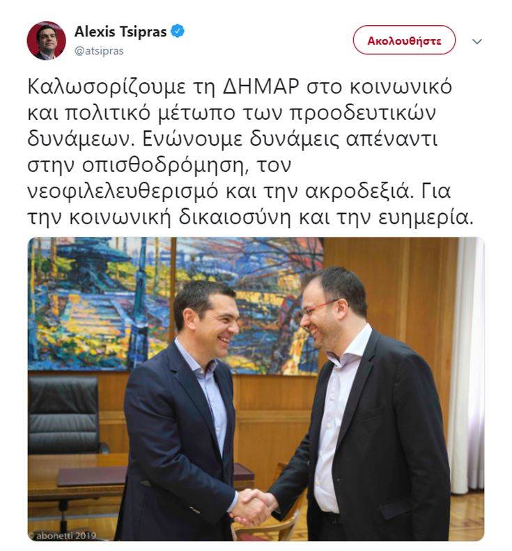 «Καλωσορίζουμε τη ΔΗΜΑΡ στο κοινωνικό και πολιτικό μέτωπο των προοδευτικών δυνάμεων»,σημειώνει ο Αλέξης Τσίπρας σε ανάρτηση του στο Twitter αναφορικά με τη συνάντηση που είχε με τον Θανάση Θεοχαρόπουλο, έπειτα από την απόφαση της ΔΗΜΑΡ να συμπλεύσει με τον ΣΥΡΙΖΑ.