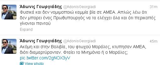 «Ακόμη και στην Βολιβία, του φτωχού Μοράλες, κτυπησαν ΑΜΕΑ, διότι διαμαρτύρονταν. Φταίει το Μνημόνιο ή ο Μοράλες;» έγραψε ο βουλευτής της Νέας Δημοκρατίας Άδωνις Γεωργιάδης στο twitter, ένα «τιτίβισμα» που προκάλεσε αίσθηση.