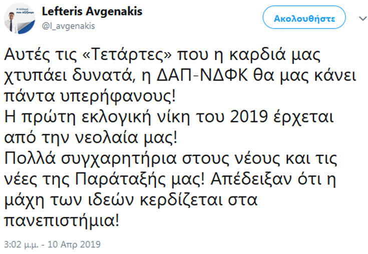 Το αποτέλεσμα των φοιτητικών εκλογών 2019 και την πρωτιά της ΔΑΠ-ΝΔΦΚ σχολίασε με ένα μήνυμά του στο Twitter ο γραμματέας της ΝΔ, Λευτέρης Αυγενάκης.
