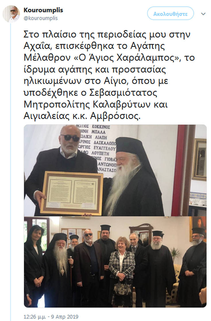 Στο μήνυμά του στο Twitter ο κ. Κουρουμπλής έγραφε: «Στο πλαίσιο της περιοδείας μου στην Αχαΐα, επισκέφθηκα το Αγάπης Μέλαθρον “O Άγιος Χαράλαμπος”, το ίδρυμα αγάπης και προστασίας ηλικιωμένων στο Αίγιο, όπου με υποδέχθηκε ο Σεβασμιότατος Μητροπολίτης Καλαβρύτων και Αιγιαλείας κ.κ. Αμβρόσιος».