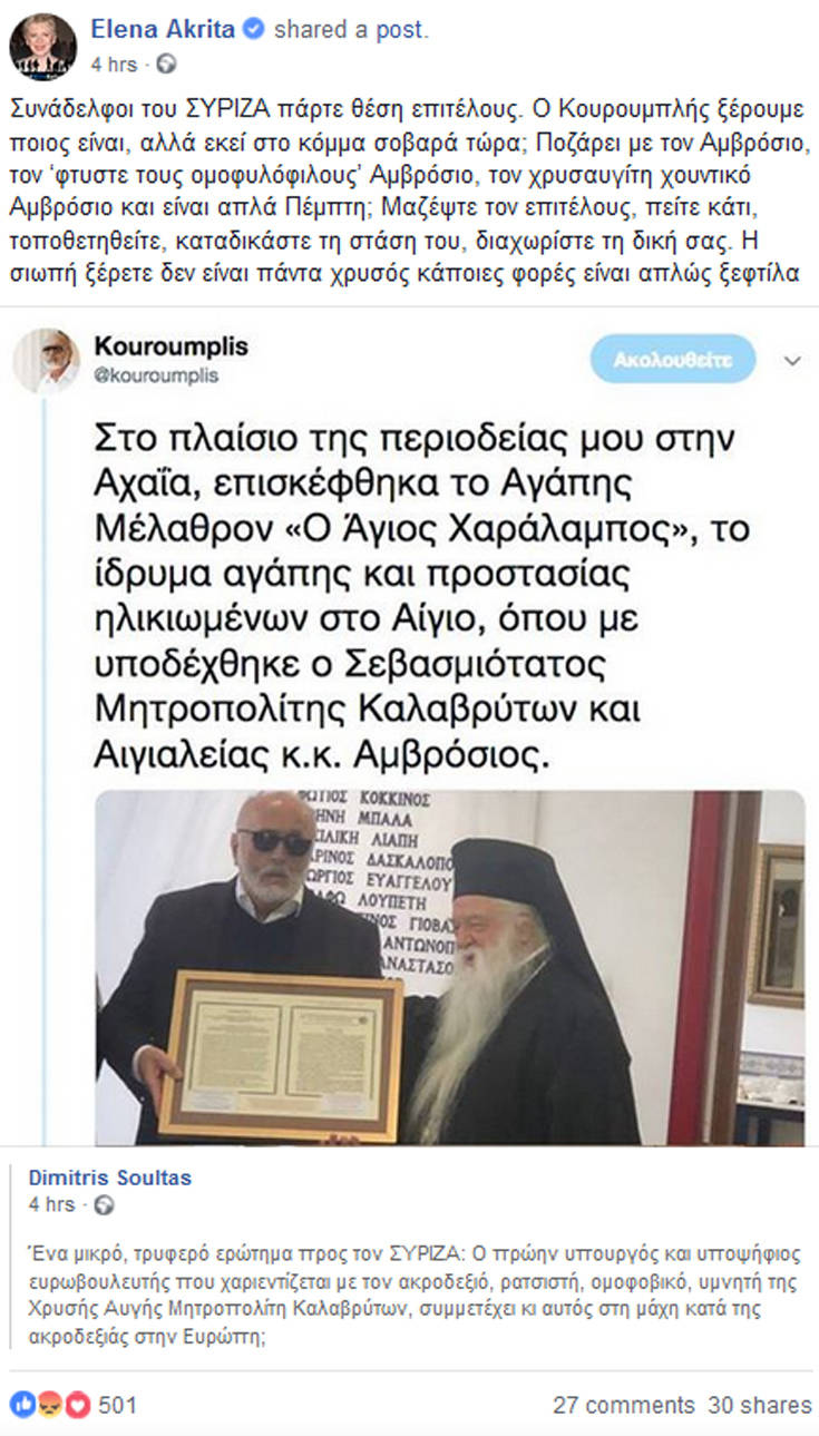 Η ανάρτησή του αυτή που συνοδευόταν από δύο φωτογραφίες προκάλεσε την αντίδραση της Έλενας Ακρίτα, η οποία μέσω Facebook σχολίασε: «Συνάδελφοι του ΣΥΡΙΖΑ πάρτε θέση επιτέλους. Ο Κουρουμπλής ξέρουμε ποιος είναι, αλλά εκεί στο κόμμα σοβαρά τώρα; Ποζάρει με τον Αμβρόσιο, τον “φτύστε τους ομοφυλόφιλους” Αμβρόσιο, τον χρυσαυγίτη χουντικό Αμβρόσιο και είναι απλά Πέμπτη;